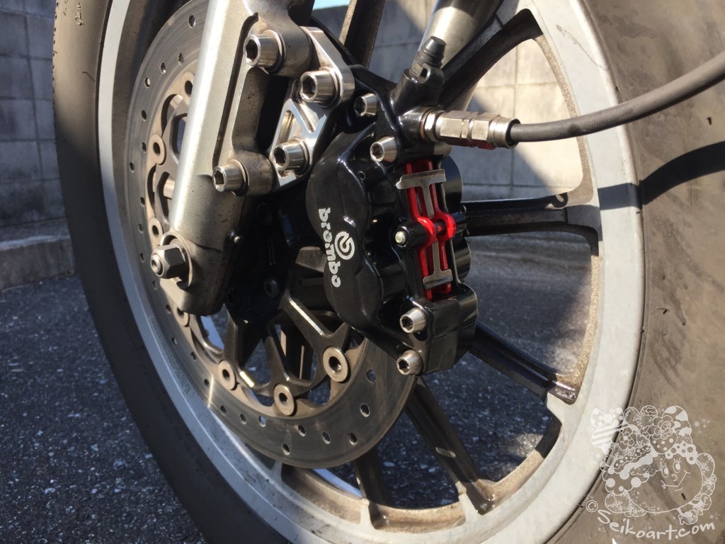 その対策としてブレーキディスクの大口径化と、キャリパーはいっちょ前にもブレンボを装着しています。